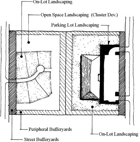 B. Figure 06.110 shows how a property is divided into areas for peripheral bufferyards, street bufferyards, on-lot landscaping, open space landscaping, and parking lot landscaping. Each area must be measured to determine the amount of landscaping required. The landscaping areas do not overlap.